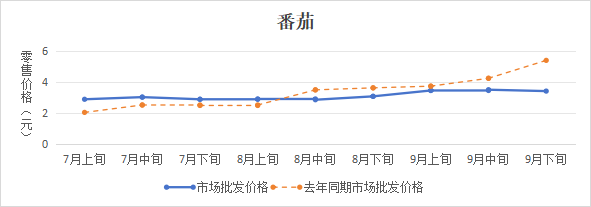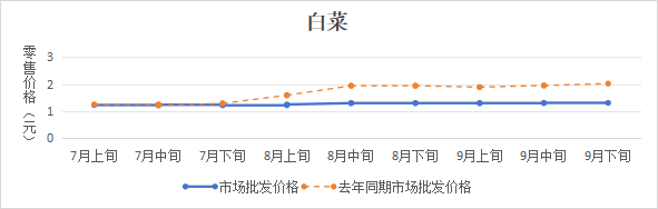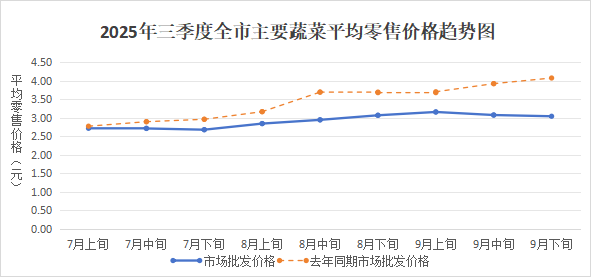 三季度全市主要蔬菜农批市场平均零售价格2.92元,比去年同期下降15.01%。今年三季度前期高温干旱,后期降雨频繁,但未形成灾害性天气,对蔬菜生产的影响小于去年,因此蔬菜价格大幅低于去年同期。7月-8月份,我市高山冷凉蔬菜上市量增加,市场需求平稳,夏季高温多雨天气导致部分产区蔬菜采收外运成本增加,蔬菜价格出现小幅波动。