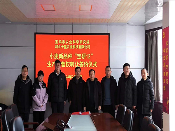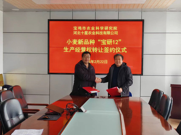 2月22日,市农科院与河北十星农业科技有限公司协商就小麦新品种宝研12品种经营权转让顺利签订了协议。这是近年我院转让的第六个农作物品种。院长王周玉与公司总经理王智广分别代表双方签约。