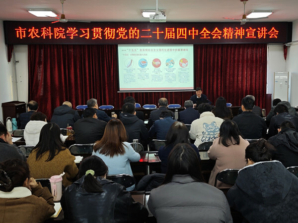 12月4日上午,市农科院举办了学习贯彻党的二十届四中全会精神宣讲会。院党委书记张锁良作专题宣讲报告,院党委副书记、院长王周玉主持会议并讲话,全体干部职工参加了会议。
