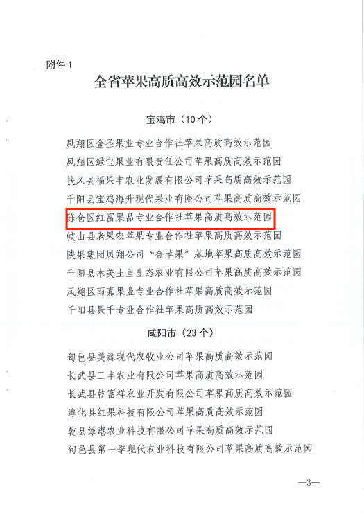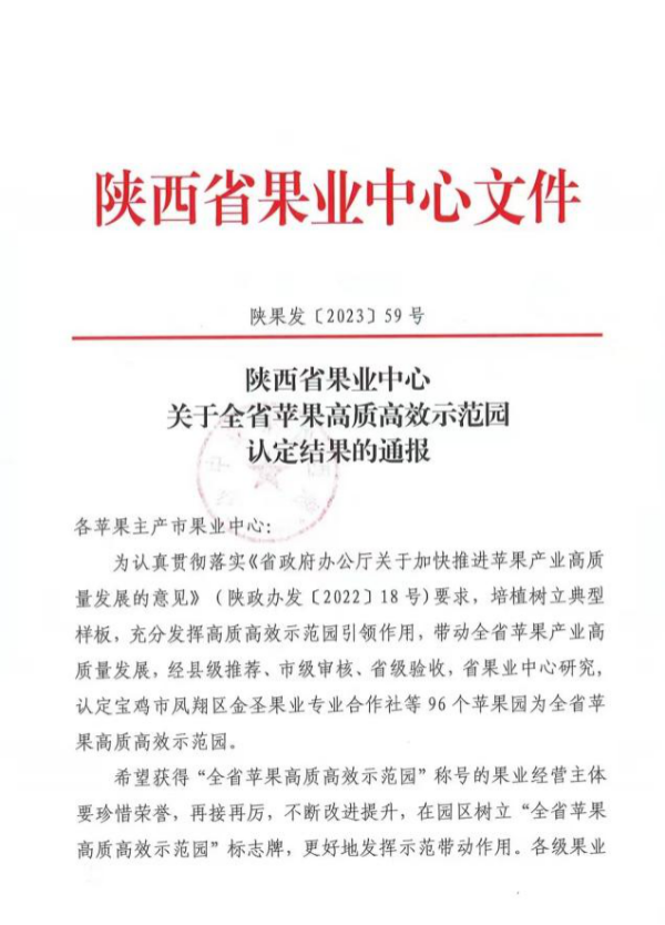 近日,陕西省果业中心发布《关于全省苹果高质高效示范园认定结果的通报》(陕果发〔2023〕59号),陈仓区红富果品专业合作社苹果示范园喜获全省苹果高质高效示范园称号,为我区赢得了荣誉。