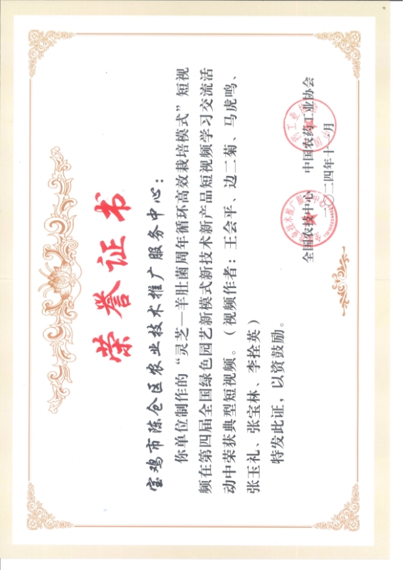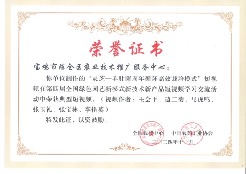为丰富农业技术推广方式方法,加快园艺作物绿色高效生产技术应用,全国农技中心与中国农药工业协会联合开展了第四届全国绿色园艺新模式新技术新产品短视频学习交流活动。接到活动通知后,陈仓区农技中心领导高度重视,安排专业团队积极进行申报,通过认真筹划,科学选题,精心制作,最终上报了以“灵芝—羊肚菌周年循环高效栽培模式”为题的短视频。在全国短视频学习交流活动中,该短视频从各地申报的近300个短视频中脱颖而出,被全国农技中心和中国农药工业协会评选为典型短视频,并颁发荣誉证书。