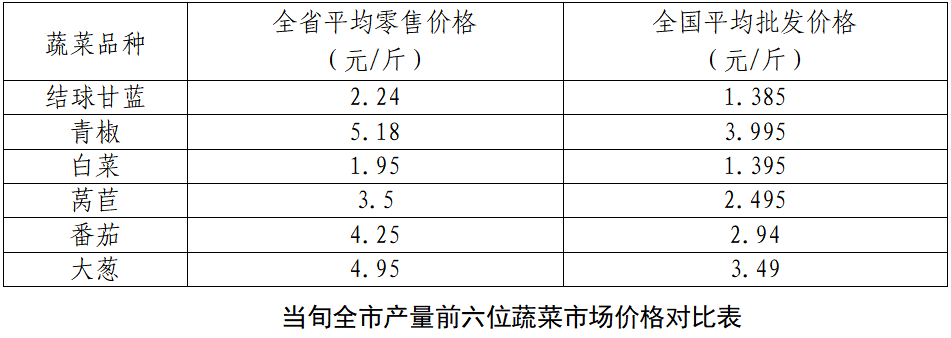 当日,我市产量前六位的蔬菜农批市场平均零售价格为:结球甘蓝2.24元/斤,比9月10日上涨1.82%;青椒5.18元/斤,比9月10日上涨11.64%;白菜1.95元/斤,比9月10日上涨3.17%;莴苣3.5元/斤,比9月10日下降2.78%;番茄4.25元/斤,比9月10日上涨13.64%;大葱4.95元/斤,比9月10日上涨2.91%。