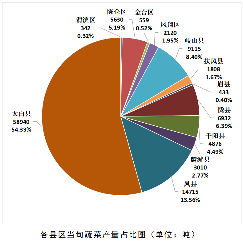 据市园艺站调查汇总数据,当旬全市蔬菜在田面积24.96万亩,同比上涨11.55%;日均供应量约10848吨,同比上涨5.19%。主要集中在太白、凤县、岐山和陇县等县区的蔬菜基地,产量占比如下: