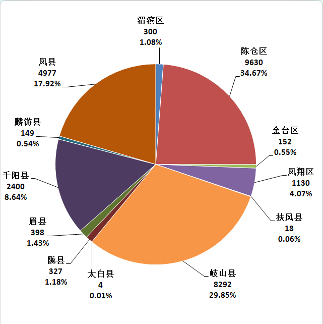 据市园艺站调查汇总数据,当旬全市蔬菜在田面积12.8万亩,同比增长40.2%,日均供应量约2777.7吨,同比增长41.8%。主要集中在陈仓、岐山、凤县等县区的蔬菜基地,产量占比如下:
