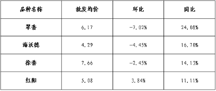 (二)猕猴桃。销区猕猴桃交易相对稳定,不同品种批发均价涨跌互异(如下图)。从环比情况来看,红阳表现出较强的价格韧性,而海沃德、红阳、翠香则出现不同程度回调。从同比情况来看,各品种价格均保持增长态势。