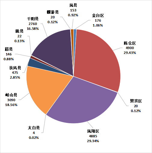 据市园艺站调查汇总数据,当旬全市蔬菜在田面积9.5万亩,同比增长63.55%,日均供应量约1665.1吨,同比增长189.78%。主要集中在陈仓、凤翔、岐山、千阳等县区的蔬菜基地,产量占比如下: