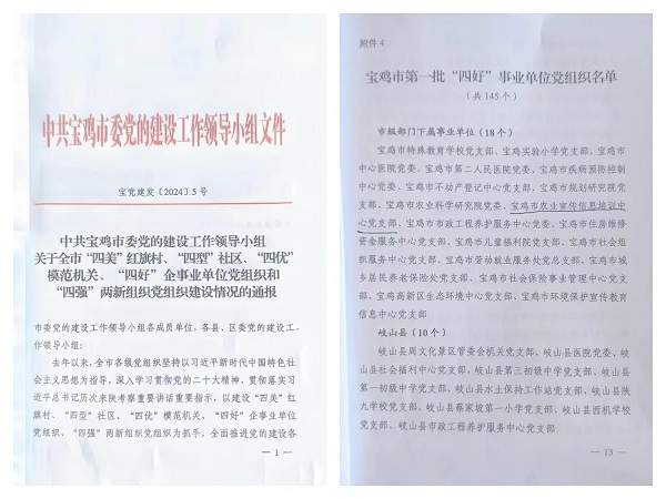 2024年7月2日,宝鸡市委党的建设工作领导小组印发了《关于全市“四美”红旗村、“四型”社区、“四优”模范机关、“四好”企事业单位党组织和“四强”两新组织党组织建设情况的通报》,市农宣中心党支部被评为首批建成全市“四好”事业单位党组织。这既是对市农宣中心党建工作的肯定,也是对农宣工作高质量发展的鼓励和鞭策。