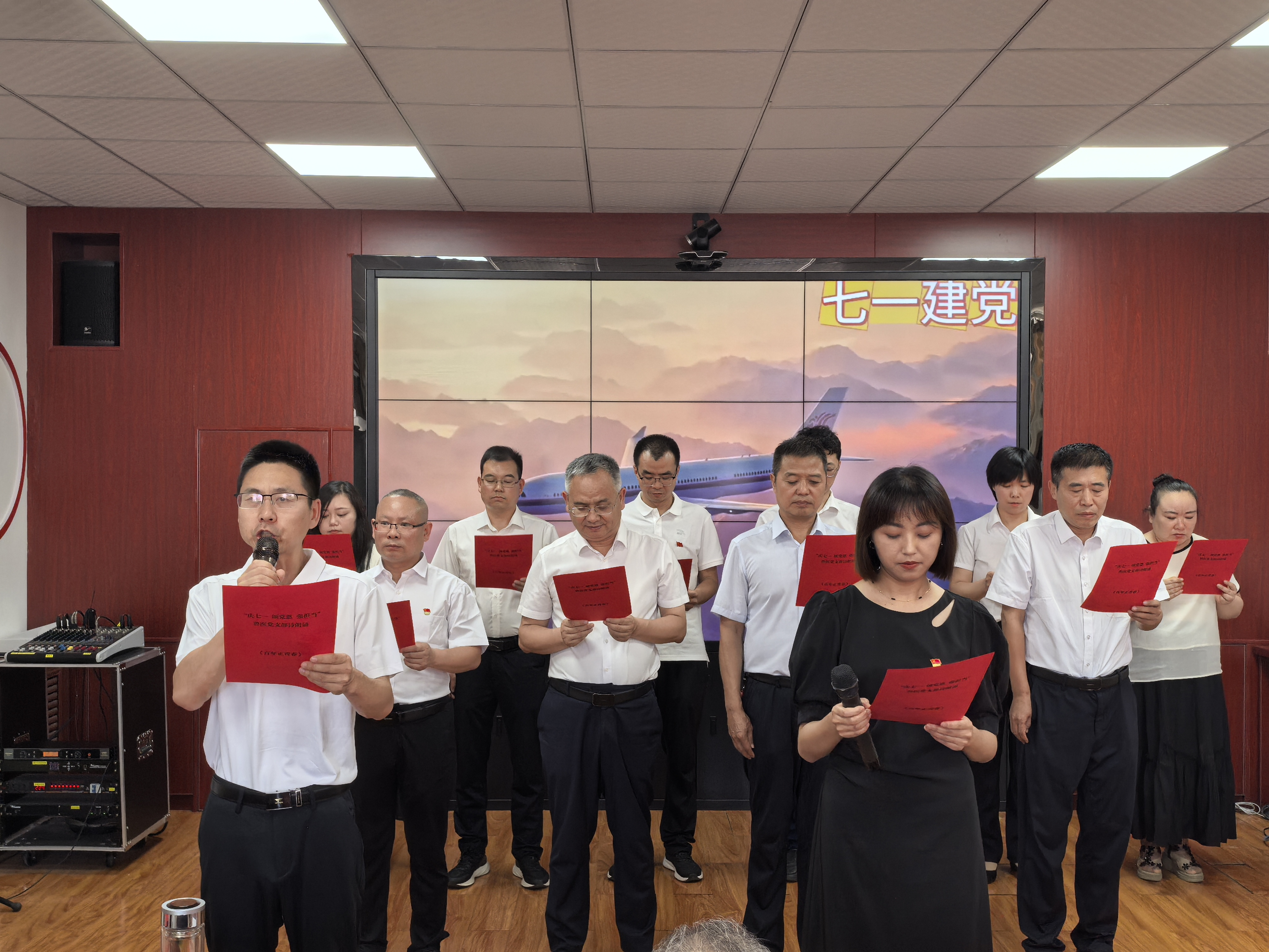 文艺表演颂党恩。中心党员干部精心排练、真情演绎了《百年正青春》《我是共产党员》《党恩常记于心,担当永践于行》《歌唱祖国》等节目,用诗词和歌声表达对革命先烈的崇敬与仰慕,抒发对党的无限忠诚和热爱。五星闪耀,皆为信仰,清澈的爱,只为中国。在《歌唱祖国》的合唱声中,大家的爱国情怀汹涌激荡,承托起奋勇向前、矢志不渝的民族梦想。