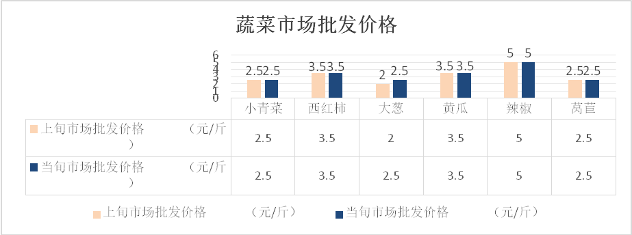 据农业农村部监测数据,4月23日相关品种全国平均批发价格:小青菜1.59元/斤,西红柿2.3元/斤,大葱1.29元/斤,黄瓜1.72元/斤,辣椒2.37元/斤,莴苣1.5元/斤。我市主要蔬菜品种批发价格较全国平均批发价格相近或略高。