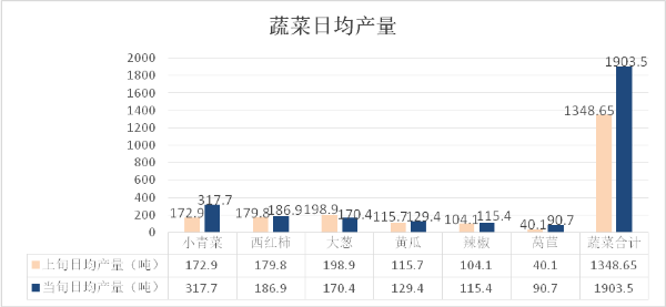 当前全市蔬菜在田面积15.39万亩,日均供应量约1903.5吨,与上年同期基本持平。主要集中在岐山、凤翔、扶风、陈仓、陇县等县区的蔬菜基地,当旬产量前六位的蔬菜依次为:小青菜、西红柿、大葱、黄瓜、辣椒、莴苣。其中,设施蔬菜主产品种为西红柿(日均产量186.9吨,产地收购价格1.7-2.2元/斤)、黄瓜(日均产量129.4吨,产地收购价格0.7-1.0元/斤)、辣椒(日均产量115.4吨,产地收购价格1.2-1.8元/斤);露地蔬菜主产品种为小青菜(日均产量317.7吨,产地收购价格0.7-1.0元/斤)、大葱(日均产量170.4吨,产地收购价格 0.8-1.0元/斤)、莴苣(日均产量90.7吨,产地收购价格0.8-1.0元/斤)。