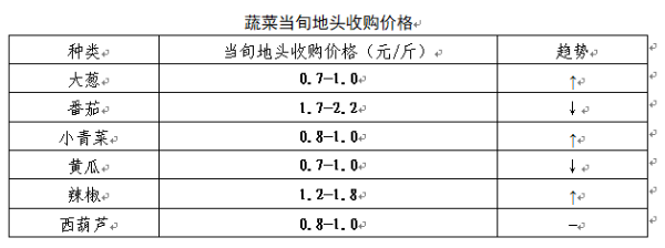 随着天气回暖,全市蔬菜生产形式持续变好,与4月中旬比,蔬菜种植面积稳中有增,产量呈上升态势,生产供应有保障。随着蔬菜生产逐步北扩,冷棚蔬菜上市量增加,蔬菜供应衔接较为顺畅,我市菜价与4月中旬相比整体保持稳定;受“五一”小长假影响,采购商积极备货,市场购买力增强,部分菜价呈需求性上涨。