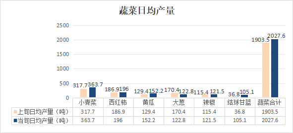 当前全市蔬菜在田面积20.88万亩,日均供应量约2027.6吨,与上年同期基本持平。主要集中在岐山、凤翔、扶风、陈仓、陇县等县区的蔬菜基地,当旬产量前六位的蔬菜依次为:小青菜、西红柿、大葱、黄瓜、辣椒、结球甘蓝。其中,设施蔬菜主产品种为西红柿(日均产量196吨,产地收购价格1.9-2.4元/斤)、黄瓜(日均产量152.2吨,产地收购价格0.7-1.0元/斤)、辣椒(日均产量121.5吨,产地收购价格1.2-1.6元/斤);露地蔬菜主产品种为小青菜(日均产量363.7吨,产地收购价格1.0-1.2元/斤)、大葱(日均产量122.8吨,产地收购价格0.9-1.1元/斤)、结球甘蓝(日均产量105.1吨,产地收购价格0.5-0.7元/斤)。