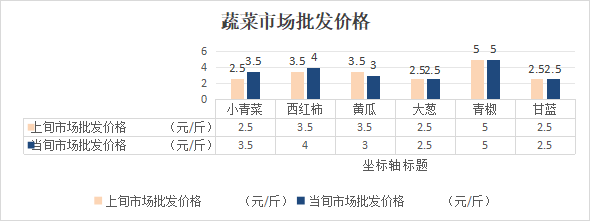 目前,各类蔬菜市场供应充足,整体价格保持稳定,部分蔬菜价格小幅上涨。据省发展改革委价格监测局相关数据,5月7日我市主要蔬菜品种批发价格:小青菜无监测数据,经调度批发价格为3.5元/斤,比4月30日上涨40%;西红柿4元/斤,比4月30日上涨14.3%;黄瓜3元/斤,比4月30日下跌14.3%;大葱2.5元/斤,与4月30日持平;青椒5元/斤,与4月30日持平;甘蓝2.5元/斤,与4月30日持平。当前市场价格最高的蔬菜品种为豆角,市场零售价格7元/斤。