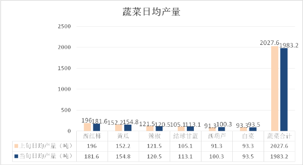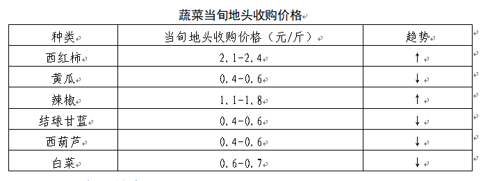 当前全市蔬菜在田面积25.34万亩,日均供应量约1983.2吨,与上年同期相比略有增长。主要集中在岐山、陈仓、扶风、凤翔、陇县等县区的蔬菜基地,当旬产量前六位的蔬菜依次为:西红柿、黄瓜、辣椒、结球甘蓝、西葫芦、白菜。其中,设施蔬菜主产品种为西红柿(日均产量181.6吨,产地收购价格2.1-2.4元/斤)、黄瓜(日均产量154.8吨,产地收购价格0.4-0.6元/斤)、辣椒(日均产量120.5吨,产地收购价格1.1-1.8元/斤)、西葫芦(日均产量100.3吨,产地收购价格0.4-0.6元/斤);露地蔬菜主产品种为结球甘蓝(日均产量113.1吨,产地收购价格0.4-0.6元/斤)、白菜(日均产量93.5吨,产地收购价格0.6-0.7元/斤)。