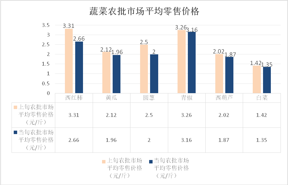 据农业农村部监测数据,5月28日相关品种全国平均批发价格:西红柿2.38元/斤,黄瓜1.3元/斤,葱头(洋葱)1.31元/斤,青椒2.05元/斤,西葫芦1.16元/斤,白菜0.77元/斤。我市主要蔬菜品种农批市场平均零售价格较全国平均批发价格相近或略高。