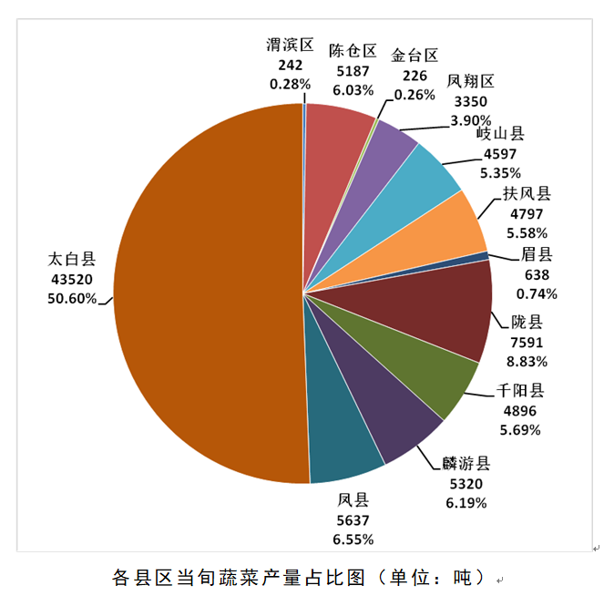 据市园艺站调查汇总数据,当旬全市蔬菜在田面积35.96万亩,同比上涨25.21%;日均供应量约8600吨,环比上涨11.89%。主要集中在太白、陇县、凤县和麟游等县区的蔬菜基地,产量占比如下: