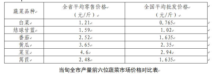 当日,我市产量前六位的蔬菜农批市场平均零售价格为:白菜1.21元/斤,比7月9日下跌3.2%;结球甘蓝1.59元/斤,比7月9日上涨3.25%;番茄2.52元/斤,比7月9日上涨23.53%;黄瓜3.65元/斤,比7月9日上涨17.74%;菜豆4.6元/斤,比7月9日上涨9.79%;莴苣2.48元/斤,比7月9日下跌1.59%。
