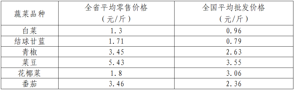 当日,我市产量前六位的蔬菜农批市场平均零售价格为:白菜1.3元/斤,与9月2日持平;结球甘蓝1.71元/斤,与9月2日持平;青椒3.45元/斤,比9月2日上涨9.18%;菜豆5.43元/斤,比9月2日上涨1.69%;花椰菜3.6元/斤,与9月2日持平;番茄3.46元/斤,比9月2日上涨12.34%。