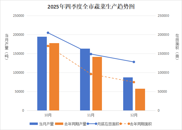 2025年第四季度,我市气温逐步下降,秋冬茬蔬菜稳步生长,越冬茬蔬菜陆续定植,全力保障冬季“菜篮子”供给充足。蔬菜生产总量同比大幅增长,价格受供需变化与成本上升影响稳中上涨。