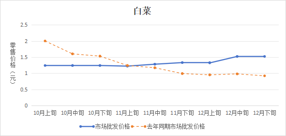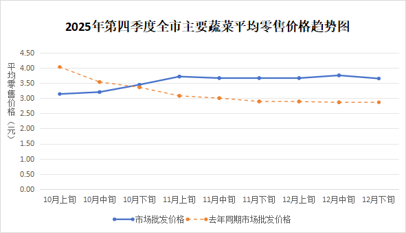 四季度全市主要蔬菜农批市场平均零售价格为3.54元,比2024年同期上涨11.86%。四季度温度较低,受秋汛、寒潮等天气影响,蔬菜生产、运输成本上涨,加之秋冬餐饮旺季和元旦节前备货市场需求量增大,因此蔬菜价格高于去年同期,呈高位运行态势。10月受高山蔬菜退市、南菜北运衔接空窗与低温阴雨影响,我市蔬菜价格持续上涨。