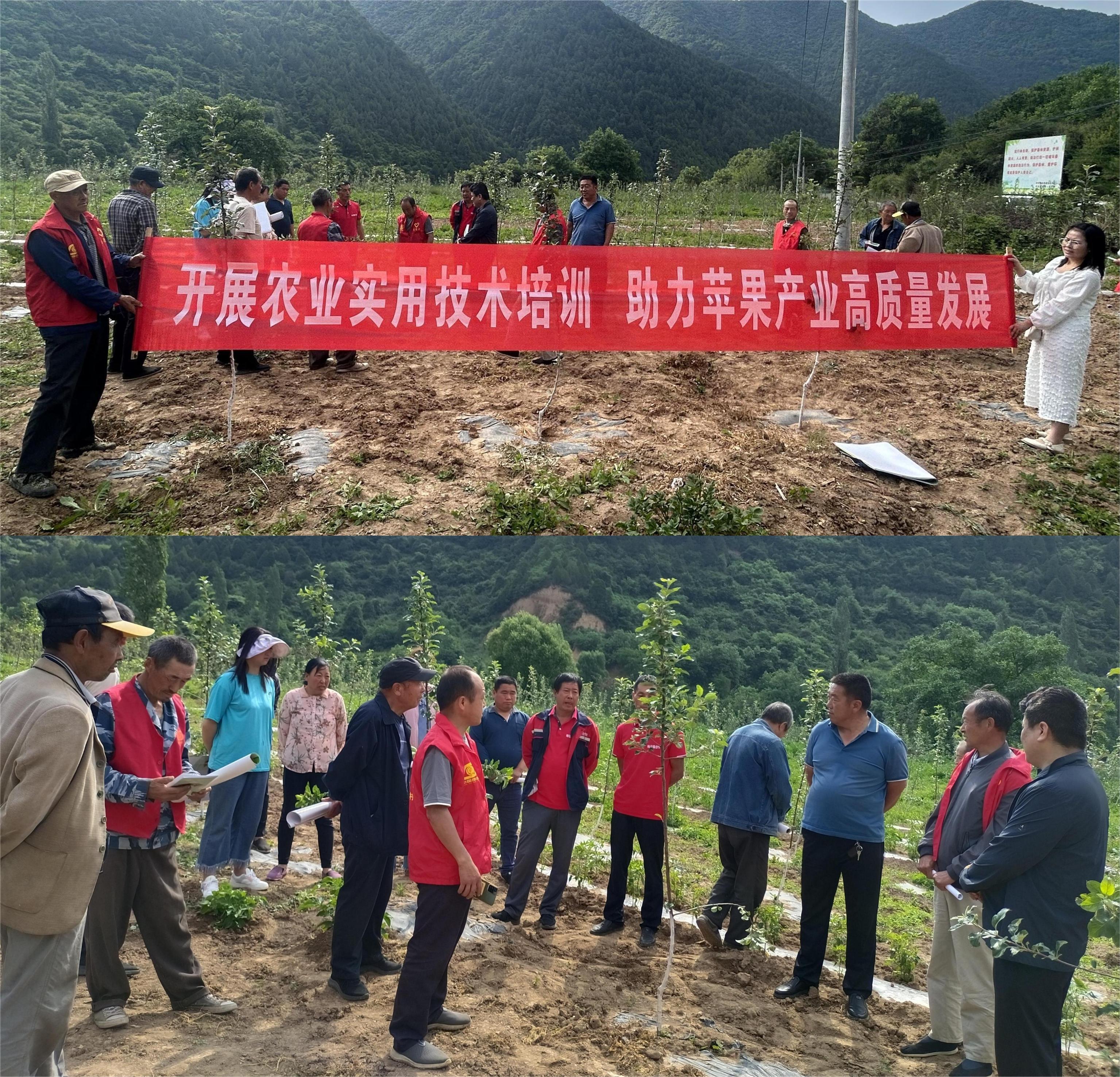 培训会上,梅花瓣果业农事服务队负责人对当地苹果老旧低效园改造后的夏季田间管理工作进行了专题培训,重点强调了当前苹果园急需开展除草、灌水、施肥、插杆、扭枝、病虫害防治等农事活动,通俗易懂的交流,使果农认识到幼园精细管理的重要性。