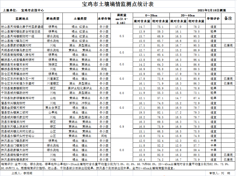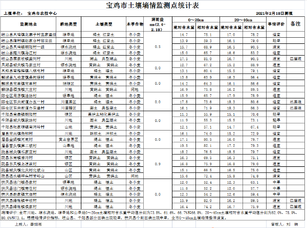 二、墒情监测结果:据2月18日岐山、凤翔、麟游、扶风、千阳、眉县、陇县和陈仓区等8个县区29个土壤墒情测报点上报统计:全市川地、塬水浇地、塬旱地和山旱地0~20cm土壤相对含水量平均值分别为73.8%、61.6%、66.7%和66.8%;20~40cm土壤相对含水量平均值分别为82.0%、75.9%、80.6%和73.4。根据墒情评价指标,岐山县、千阳县部分田块出现轻旱,扶风县部分田块出现中旱,全市0~40cm土壤墒情整体适宜。近期气温回升较快,在无有效降雨的情况下,预计我市土壤整体墒情将转为轻旱。