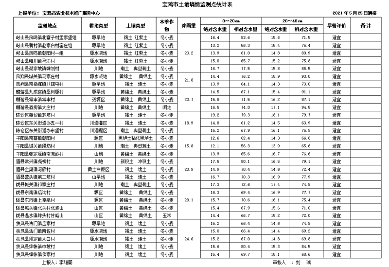 二、墒情监测结果:据5月25日岐山、凤翔、扶风、千阳、眉县、陇县、麟游和陈仓区等8个县区29个土壤墒情测报点上报统计:全市川地、塬水浇地、塬旱地和山旱地0~20cm土壤相对含水量平均值分别为71.1%、67.3%、69.9%和66.6%;20~40cm土壤相对含水量平均值分别为76.9%、77.7%、77.8%和72.9%,根据墒情评价指标0~40cm土壤墒情整体适宜。
