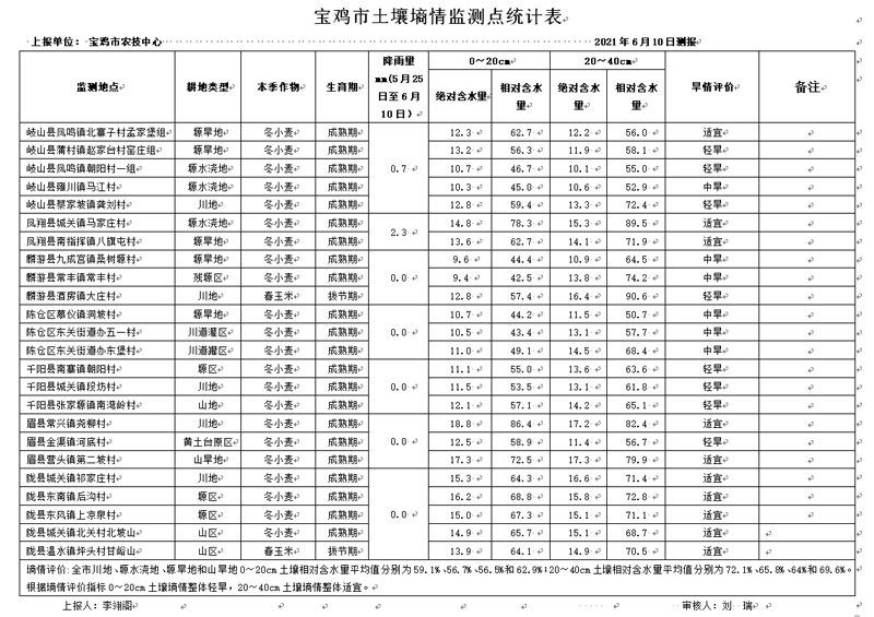 二、墒情监测结果:据6月10日岐山、凤翔、扶风、千阳、眉县、陇县、麟游和陈仓区等7个县区24个土壤墒情测报点上报统计:全市川地、塬水浇地、塬旱地和山旱地0~20cm土壤相对含水量平均值分别为59.1%、56.7%、56.5%和62.9%;20~40cm土壤相对含水量平均值分别为72.1%、65.8%、64%和69.6%。根据墒情评价指标0~20cm土壤墒情整体轻旱,20~40cm土壤墒情整体适宜。