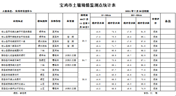 据7月24日岐山、麟游、陇县、等3个县区13个土壤墒情测报点上报统计:全市川地、塬水浇地、塬旱地和山旱地0~20cm土壤相对含水量平均值分别为76.8%、77.4%、69.5%和65.5%;20~40cm土壤相对含水量平均值分别为87.3%、94.5%、83.5%和72.2%。根据全市降雨情况及墒情评价指标,全市0~40cm土壤墒情整体适宜。