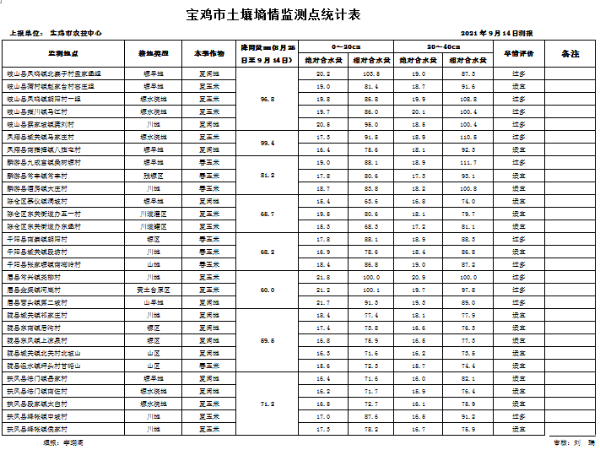 二、墒情监测结果:据9月14日岐山、凤翔、千阳、眉县、陇县、麟游、扶风和陈仓区等8个县区29个土壤墒情测报点上报统计:全市川地、塬水浇地、塬旱地和山旱地0~20cm土壤相对含水量平均值分别为83.3%、81.7%、81.4%和82%;20~40cm土壤相对含水量平均值分别为88.2%、94.4%、88.2%和82.5%。根据墒情评价指标0~40cm土壤墒情整体适宜。近期降雨较多,我市部分旱情得到缓解。