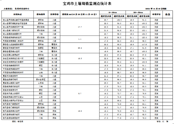 二、墒情监测结果:据10月25日岐山、凤翔、千阳、麟游、眉县、陇县、扶风和陈仓区等8个县区29个土壤墒情测报点上报统计:全市川地、塬水浇地、塬旱地和山旱地0~20cm土壤相对含水量平均值分别为87.7%、85.4%、87.2%和83.9%;20~40cm土壤相对含水量平均值分别为92.9%、96.6%、93.1%和84.9%。根据墒情评价指标0~40cm土壤墒情整体适宜。