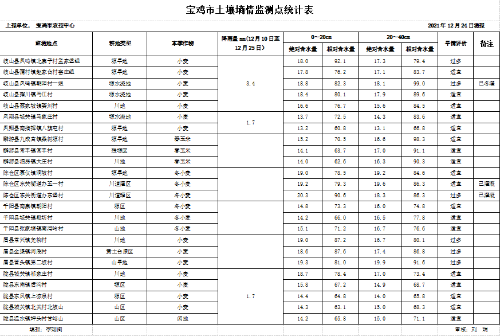 二、墒情监测结果:据12月24日岐山、凤翔、千阳、麟游、眉县、陇县、扶风和陈仓区等7个县区24个土壤墒情测报点上报统计:全市川地、塬水浇地、塬旱地和山旱地0~20cm土壤相对含水量平均值分别为77.3%、78.3%、73.2%和70.9%;20~40cm土壤相对含水量平均值分别为82.7%、90.7%、82.3%和76.5%。根据墒情评价指标0~40cm土壤墒情整体适宜。