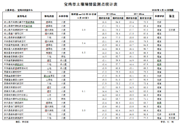 二、墒情监测结果:据1月11日岐山、凤翔、麟游、扶风、千阳、眉县和陇县等7个县区26个土壤墒情测报点上报统计:全市川地、塬水浇地、塬旱地和山旱地0~20cm土壤相对含水量平均值分别为74.7%、70.0%、69.2%和66.1%;20~40cm土壤相对含水量平均值分别为80.7%、79.8%、77.7%和73.8%。根据墒情评价指标0~40cm土壤墒情整体适宜,千阳、扶风部分田块出现轻旱。