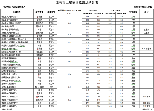 二、墒情监测结果:据8月23日岐山、陈仓、凤翔、麟游、千阳、陇县、眉县和扶风等8个县区29个土壤墒情测报点上报统计:全市川地、塬水浇地、塬旱地和山旱地0~20cm土壤相对含水量平均值分别为64.4%、61.1%、57.6%和60.9%;20~40cm土壤相对含水量平均值分别为70.3%、67.9%、65.6%和65.3%。根据墒情评价指标0~40cm土壤墒情整体轻旱到中旱。
