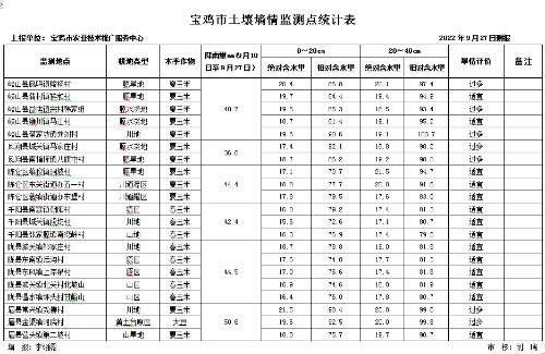 二、墒情监测结果:据9月26日岐山、陈仓、凤翔、千阳、陇县和眉县等6个县区21个土壤墒情测报点上报统计:全市川地、塬水浇地、塬旱地和山旱地0~20cm土壤相对含水量平均值分别为79.0%、86.3%、82.3%和80.2%;20~40cm土壤相对含水量平均值分别为87.1%、95.6%、92.4%和86.6%。根据墒情评价指标0~40cm土壤墒情整体适宜。